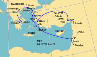 Carte du voyage missionnaire que Paul de Tarse effectue vers 54-58.